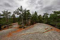 Deze foto is gemaakt tijdens een mooie wandeling in Nationaal Park Tiveden in Zweden. Het nationaal park bestaat voornamelijk uit oud bos, meren en rotsen. Bovenop het gesteente in het Tiveden Nationaal Park in Zweden zijn de boomtoppen goed te zien.