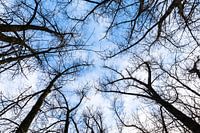 kale boomtoppen in de winter tegen een blauwe lucht