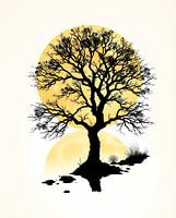 Dit ontwerp heeft een gestileerd silhouet van een boom tegen een achtergrond van twee overlappende cirkels, wat doet denken aan een zonsverduistering of een hemelse uitlijning. De boom staat centraal, met zijn ingewikkelde takken en getextureerde stam weergegeven in een gedetailleerde, illustratieve stijl. Het grimmige zwarte silhouet…
