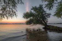 Bij de rivier de Nederrijn in de gemeente Buren ontvouwt zich een schilderachtige scène bij zonsondergang. De Betuwe, bekend om zijn natuurlijke schoonheid, onthult een betoverend stukje landschap.