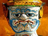 Boos kijkende bewaker bij een tempel in Bangkok, Thailand. De tempel in Bangkok is rijk versierd met allerlei ornamenten. Naast de ingang vind je de bewakers.