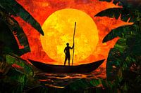 Een enkele boot troont op het water temidden van de gloeiende rode en gouden zonnestralen die de horizon in een warm licht baden. Een silhouet, sterk en vastberaden, houdt een lange paal vast en belichaamt de geest van vastberadenheid. Omringd door tropisch gebladerte straalt het tafereel een vredige maar krachtige energie uit.