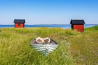 Boot en rode houten hutten in Färjestaden op het eiland Öland in Zweden.