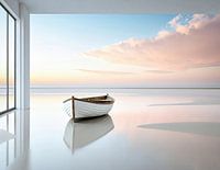 Een houten roeiboot rust op een glanzend, reflecterend wateroppervlak in een open gebouw dat uitkijkt over een rustig zeegezicht. Zachte pastelkleuren van de lucht smelten samen met de horizon en creëren een kalme sfeer in dit oerbeeld in highkey-stijl......Digital art image, ontwerp en compositie door mij, visualisatie met AI