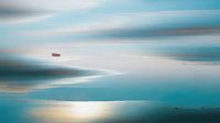 Een eenzame rode boot dobbert op een brede, kalme watervlakte in de Waddenzee en straalt een gevoel van eenzaamheid en rust uit. Lucht en zee gaan naadloos in elkaar over in zachte blauw- en grijstinten en weerspiegelen een serene sfeer.....Ontwerp en compositie door mij, visualisatie met AI