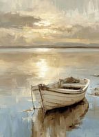 Een impressionistisch olieverfschilderij toont een kleine boot op kalm water, omgeven door zacht ochtendlicht. De gedempte beige en witte tinten, gecombineerd met de spiegelachtige reflectie op het wateroppervlak, creëren een vredige, harmonieuze sfeer. De achtergrond, met een uitgestrekte lucht die overgaat van grijs naar warme geeltinten, versterkt de rust en eenvoud van de scène. Dit sfeervolle kunstwerk is perfect voor liefhebbers van maritieme motieven, stijlvolle woonruimtes of hoogwaardige wanddecoraties die impressionistische elegantie en een ontspannen affiniteit met de natuur uitstralen.