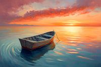Een eenzame boot drijft in een zachte omhelzing van water en lucht, omringd door gouden licht dat de horizon kust. De zachte golven weerspiegelen oranje en roze tinten terwijl de zon majestueus in de achtergrond zakt. Een gevoel van kalmte en ontdekking doordringt de scène, alsof de toekomst danst op de golven.