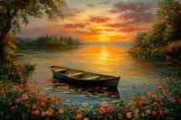 Zachte zonnestralen kussen het gladde wateroppervlak en toveren een warm, gouden licht tevoorschijn. Een eenzaam bootje schommelt zachtjes op de golven, omringd door een bloeiende zee van kleur. De bloemen op de oever dansen in de zachte bries, terwijl de lucht oplicht in levendige pastelkleuren - een harmonieus samenspel van de natuur…