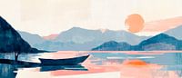 Zachte pastelkleuren omarmen het kalme water, terwijl een eenzame boot zachtjes op de golven wiegt. De ondergaande zon baadt het landschap in warme kleurtonen en verspreidt een sfeer van rust. Dit artistieke tafereel is perfect voor de slaapkamer om een gevoel van ontspanning en rust uit te stralen.