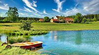 Een kleine roeiboot op het meer. Een landelijke idylle. Een boerderij met een groene weide en een klein meertje.
