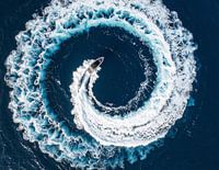 Boot in zee maakt cirkels en golven met luchtfoto