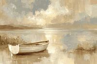 Een rustig olieverfschilderij toont een boot op een rustig meer in zachte beige en grijze tinten. Zachte penseelstreken en een minimalistische compositie geven het werk een vredige, tijdloze sfeer. De pastelkleurige lucht met delicate wolken wordt weerspiegeld op het gladde wateroppervlak, terwijl heuvels in de verte en zacht zonlicht…