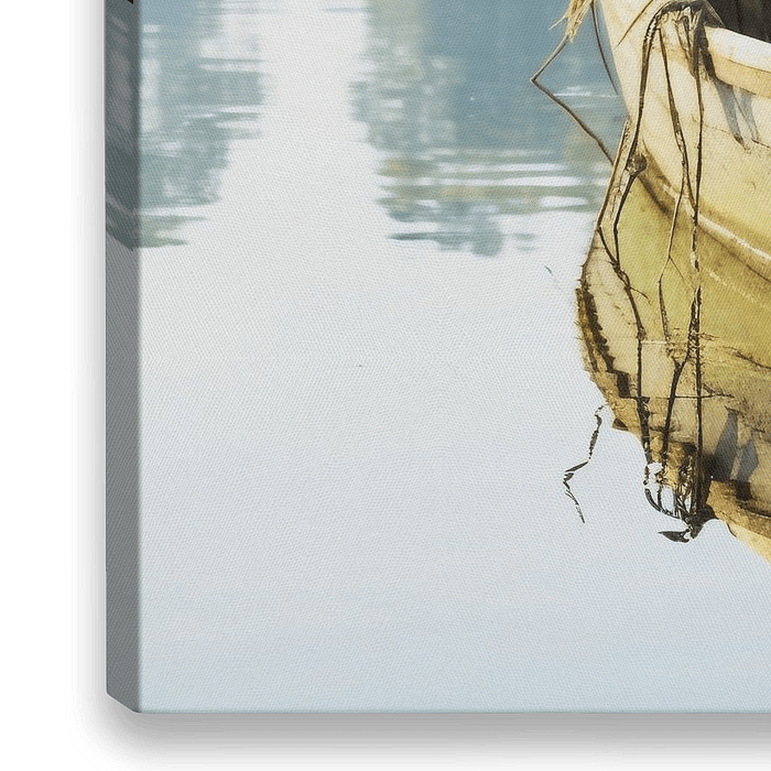 De kunstwerk toont een houten boot aan de oever van een schilderachtig meer. De kleur van de boot is vervaagd en afgebladderd, wat duidt op zijn leeftijd en de invloed van de elementen. Het kalme meer strekt zich uit op de achtergrond, het oppervlak wordt zachtjes gekust door de golven.