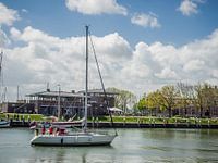Boot die vaart naar de ligplaats in de haven van Enkhuizen