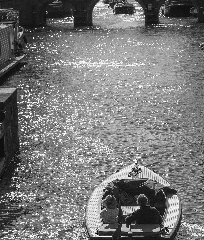 Liefdeskoppel vaart over de Amsterdamse grachten. Deze foto heb ik gemaakt toen ik een serie straatfoto's wilde maken van Amsterdam. Dit beeld vond ik mooi omdat je een wat ouder koppel ziet varen. Romantisch beeld en dan besef je dat romantiek en verliefdheid niet alleen is weggelegd voor tieners.