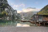 Uitzicht vanaf de oever van de Pragser Wildsee naar de bootshut en de rij boten die op het meer dobberen. Langzaam komt de zon op en verdrijft de laatste mistflarden.