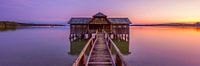 Panoramisch uitzicht op het boothuis bij zonsondergang, steigers, Beieren, Duitsland
