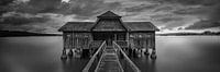 * AMMERSEE PANORAMA * Zwart-wit landschap. Voetgangersbrug met boothuis / houten huis aan de Ammersee in Beieren in de sfeervolle zonsopgang.