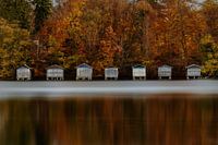 Een rij boothuizen voor een herfstig loofbos, gefotografeerd met lange belichtingstijd