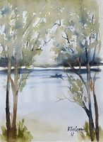 Deze aquarel ademt een serene, bijna dromerige sfeer uit. De kunstenaar gebruikt zachte penseelstreken en subtiele kleurvariaties in groen, blauw en bruin om een rustiek landschap vast te leggen. Op de voorgrond staan slanke bomen met transparant geschilderd gebladerte, waardoor het licht vrij spel krijgt en een gevoel van ruimte ontstaat.