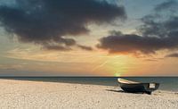 Een bootje eenzaam op het lege strand met een mooie zonsopkomst.