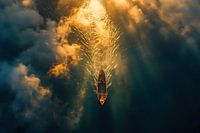 Een man vaart alleen op een kalme zee, terwijl het zonlicht subtiel door een dreigend donker wolkendek breekt. De lucht en het water reflecteren prachtige tinten van diepblauw, grijs, groen en goud, die het schilderij een magische sfeer geven. De serene compositie straalt een gevoel van eenzaamheid en hoop uit, een perfect kunstwerk dat…