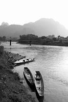 Rivierenlandschap. Traditionele houten kano's in de Nam Song rivier, Karstgebergte in Vang Vieng, Laos. Mist in een landschap van Karst bergen. Mystieke, mysterieuze sfeer. Rivierlandschap in zwart wit.