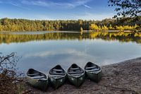 Foto van een Drents landschap. Midden in de bossen bij Schoonloo ligt deze ven verstopt. De bootjes of kano's liggen aan de kant, klaar voor een volgend tochtje vol vermaak.