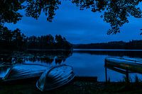 Een meertje in zuid Zweden bij het dorpje Överlida. Het licht van de maan zorgt voor glans op het meer en op de bootjes.