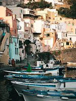 Bootjes op het Italiaanse eiland Procida met de traditionele Italiaanse huizen op de achtergrond. De verse vis van de gevangen in de ochtend kun je aan de talloze restaurants aan de boulevard meteen opeten.