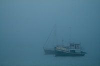 Twee dobberende vissersbootjes op een rustige zee. De zeemist geeft het beeld iets mysterieus.