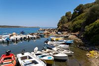 Gekleurde bootjes op het Griekse eiland Samos. Bootjes liggen in een halve cirkel aan het strand. Op de achtergrond een blauwe lucht.