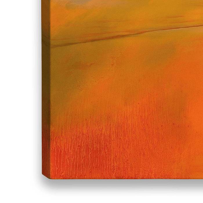 Dit schilderij creëert een verbluffende sfeer in een intense oranje tint, die de kleur van liefde en passie symboliseert. Het toont boten die langzaam kleiner worden tegen de horizon terwijl ze naar een verre bestemming varen. De wolken worden grillig gereflecteerd in het kalme wateroppervlak en het centrale licht in fel oranje staat…
