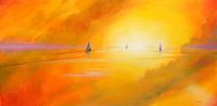 Dit schilderij creëert een verbluffende sfeer in een intense oranje tint, die de kleur van liefde en passie symboliseert. Het toont boten die langzaam kleiner worden tegen de horizon terwijl ze naar een verre bestemming varen. De wolken worden grillig gereflecteerd in het kalme wateroppervlak en het centrale licht in fel oranje staat…