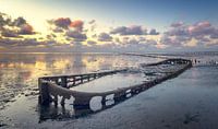 Bootwrak tijdens laag water in de Wadden zee nabij Wierum (Zonsondergang) mooie wolkenlucht met reflectie op het water