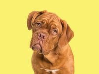 Portret van een bordeauxdog tegen een gele achtergrond kijkend in de camera