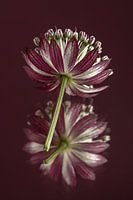 "Bordeauxrood / paars: Een Zeeuws knoopje weerspiegelt in het oppervlak" is een foto van een klein bloemetje (Zeeuws Knoopje of Astrantia Major) dat ligt op een spiegelend oppervlak. Doordat de achtergrond ook een donker bordeauxrode - paarse kleur heeft, word het beeld rustig.