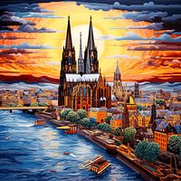Dit dynamische kunstwerk vangt de iconische achtergrond van de Dom van Keulen in een levendige, impressionistische stijl die doet denken aan geschilderde texturen. De majestueuze kathedraal rijst dominant op in de lucht met zijn donkere silhouetten en ingewikkelde torens. Een fel oranje-gele zon gaat dramatisch onder aan de horizon en baadt het tafereel in warme, gloeiende kleuren die worden weerspiegeld in de wolken. De Rijn stroomt in sterke blauwe tinten op de voorgrond, bezaaid met kleine bootjes en omzoomd door een gedetailleerde promenade met gebouwen en bomen. Het totaalbeeld is een energieke hommage aan de stad en haar bezienswaardigheden, doordrenkt met een expressief kleurenpalet.