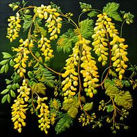Dit prachtige kunstwerk heeft een gedetailleerde afbeelding van gouden gouden gouden goudenregenbloemen in de stijl van tapisserieborduurwerk. De felgele strengen bloemen hangen zwaar aan de takken en vormen een schril contrast met de diepe, donkere achtergrond. De bladeren en takken zijn geborduurd met een ongelooflijke textuur die bijna lijkt op driedimensionale vormen. Elke steek is zorgvuldig uitgevoerd om de complexiteit en de verschillende tinten van de plant vast te leggen, van het lichte groen van de jonge bladeren tot de donkere, bijna blauwe tinten van de schaduwen. De hele afbeelding is een meesterwerk van vakmanschap dat de schoonheid van de natuur vastlegt in een kunstzinnige vorm.