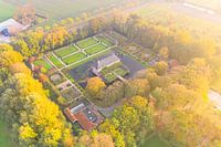 Luchtfoto van borg Verhildersum in de herfst in het warme ochtendlicht tijdens zonsopkomst. Verhildersum ligt bij het dorpje Leens in de provincie Groningen.