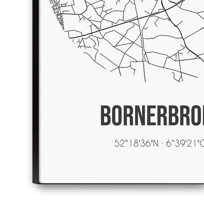 Zwart-witte landkaart, stratenplan of plattegrond van Bornerbroek. Bornerbroek is gelegen in Twente, in de gemeente Almelo, provincie Overijssel. Op de stadskaart zijn alle openbare wegen in Bornerbroek opgenomen. Verder is de kaart voorzien van de coördinaten van het centrum van Bornerbroek.