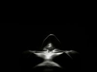 Deze topless, naakte meid laat in een donkere naaktfoto haar buste zien in schrander licht en veel schaduw. Haar keel, kin, borsten en tepels zijn naakt en zijn in het licht erotisch en minimalistisch bloot.