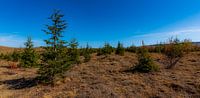 Een vers geplant dennenbos, druk bezig met overleven in de droogte.