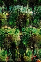 Bomen strekken zich uit als grafische nerven, terwijl grafzerken en kruizen een ritmisch, bijna architectonisch raster vormen. Tussen deze stille getuigen duiken menselijke silhouetten op: deels herkenbaar, deels versmolten met hun omgeving – als herinneringen die langzaam vervagen maar nooit helemaal verdwijnen. Op de voorgrond paradeert een kleurrijke fazant, levendig contrasterend met het sluimerende thema van vergankelijkheid.
