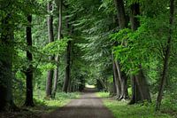 Een foto van een pad door het bos op de Hoge Veluwe. De lijnen van het pad geven perspectief (diepte) aan het beeld. Ook de lichtval van links werkt heel goed in dit landschap. De bomen aan de rechterkant van het pad hellen naar het licht toe, zo ook de takken van de Beuk in het midden van het beeld. Het licht en de schaduwen maken het een interessante compositie.