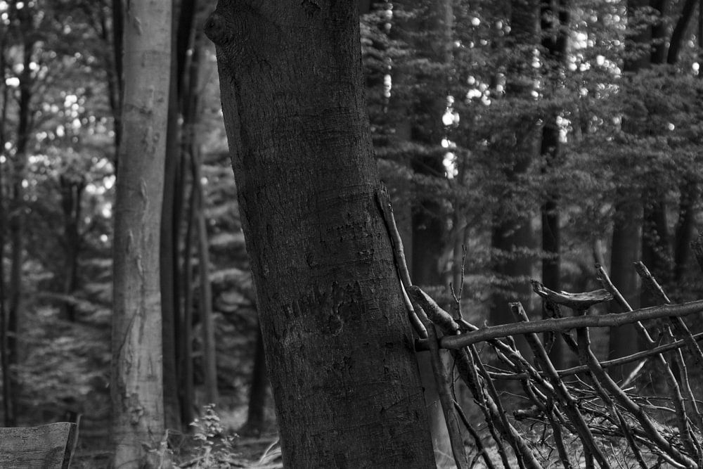 Foto gemaakt in het bos, waar de stammen van de bomen een ritme vormen.