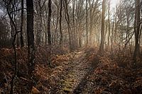 Vroege ochtendzon op een winterochtend in een nog mistig bos van Nationaal Park de Groote Peel.