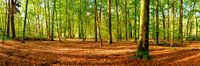 Panorama van een helder bos met grote bomen, veel herfstbladeren op de bosbodem en zonlicht op de achtergrond.
