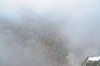 Bos in de mist in het Elbezandsteengebergte. Kleurrijke naald- en loofbomen badend in de mist. Mystieke sfeer.