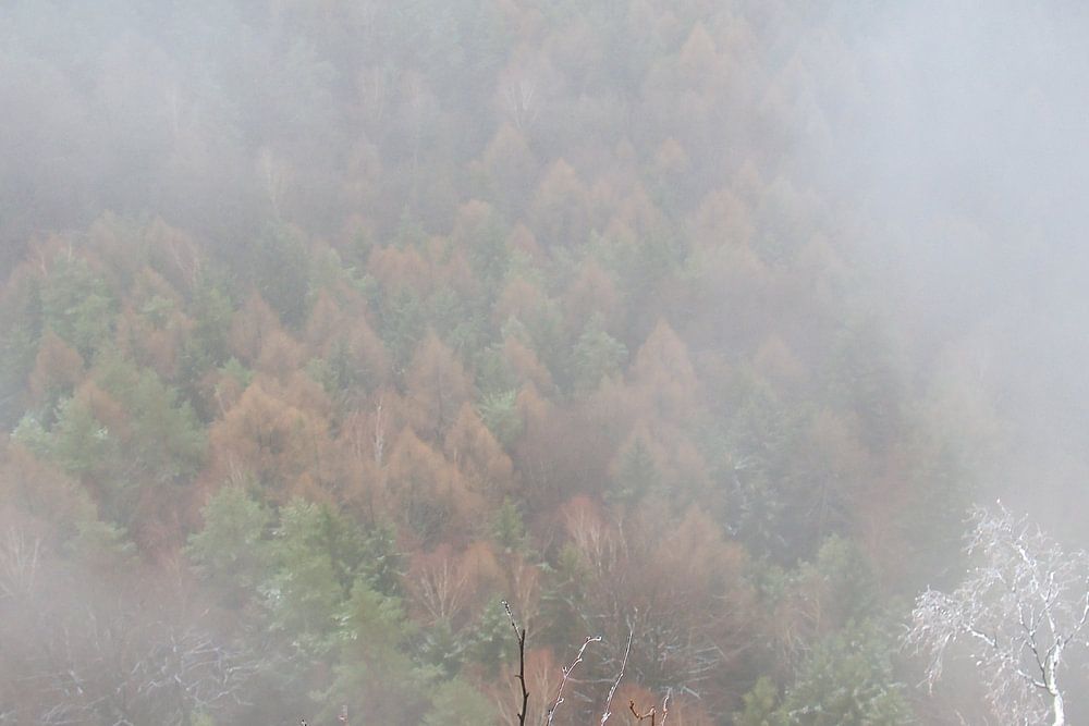 Bos in de mist in het Elbezandsteengebergte. Kleurrijke naald- en loofbomen badend in de mist. Mystieke sfeer.